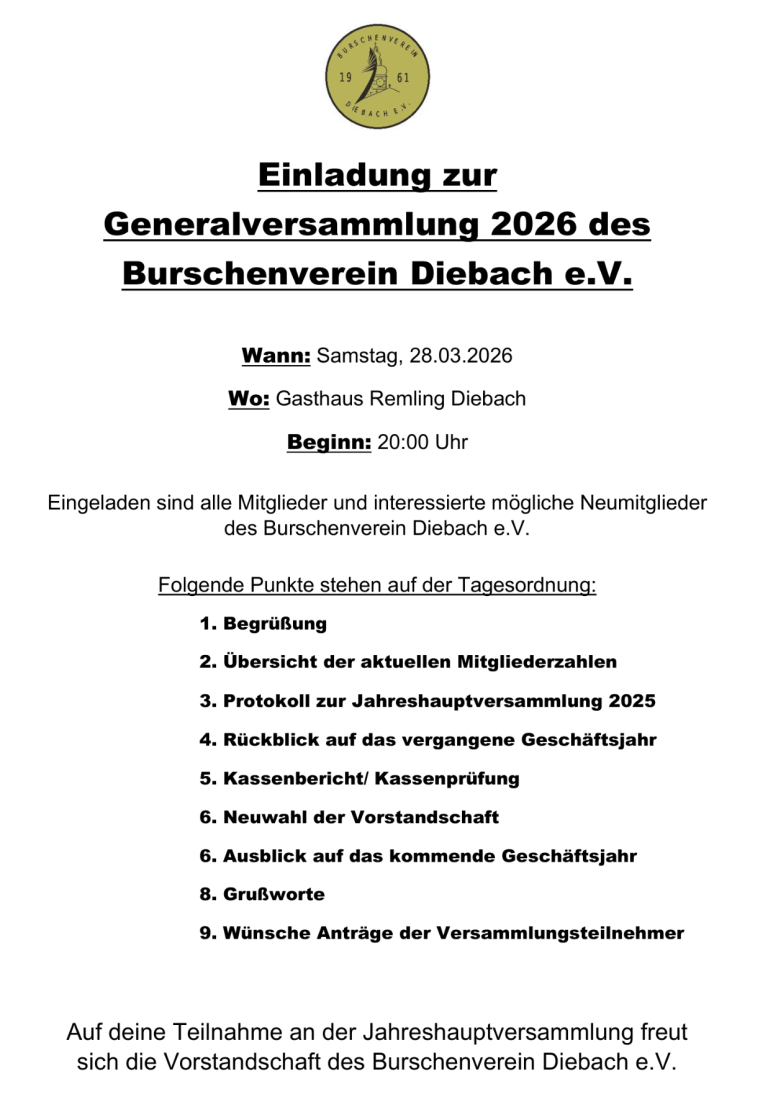 Fülle hierzu den unten im Link zur Verfügung stehenden Mitgliedsantrag und das SEPA-Lastschriftformular vollständig aus und sende beides an info@burschenverein-diebach.de